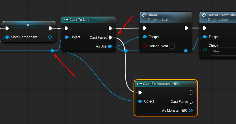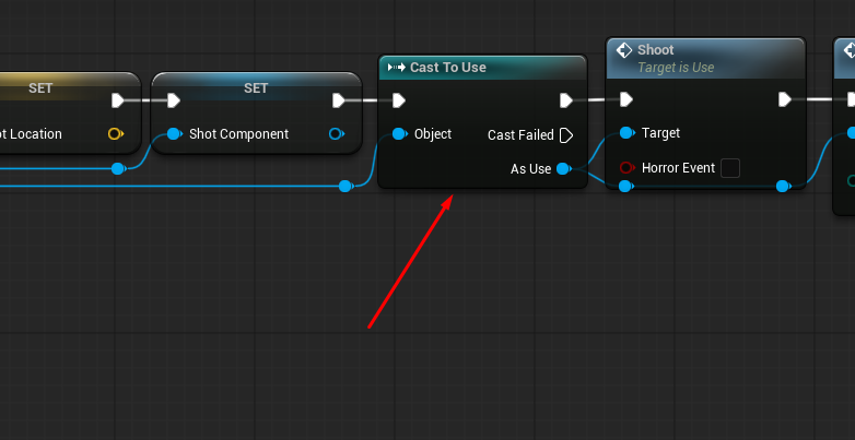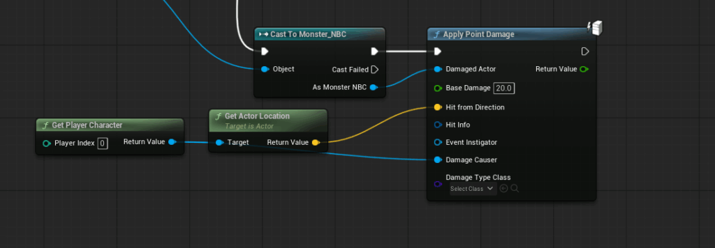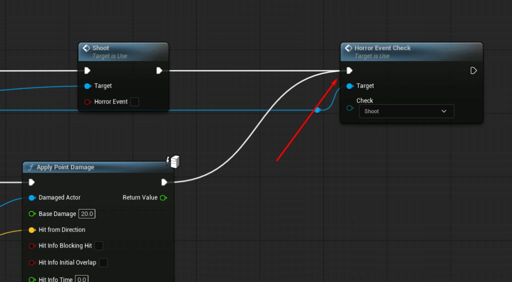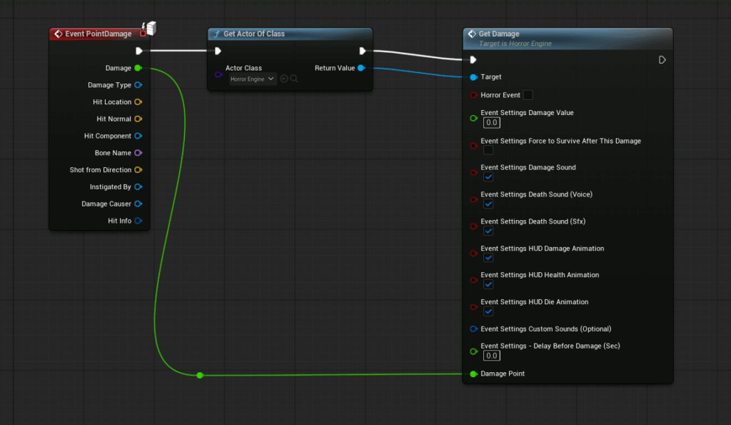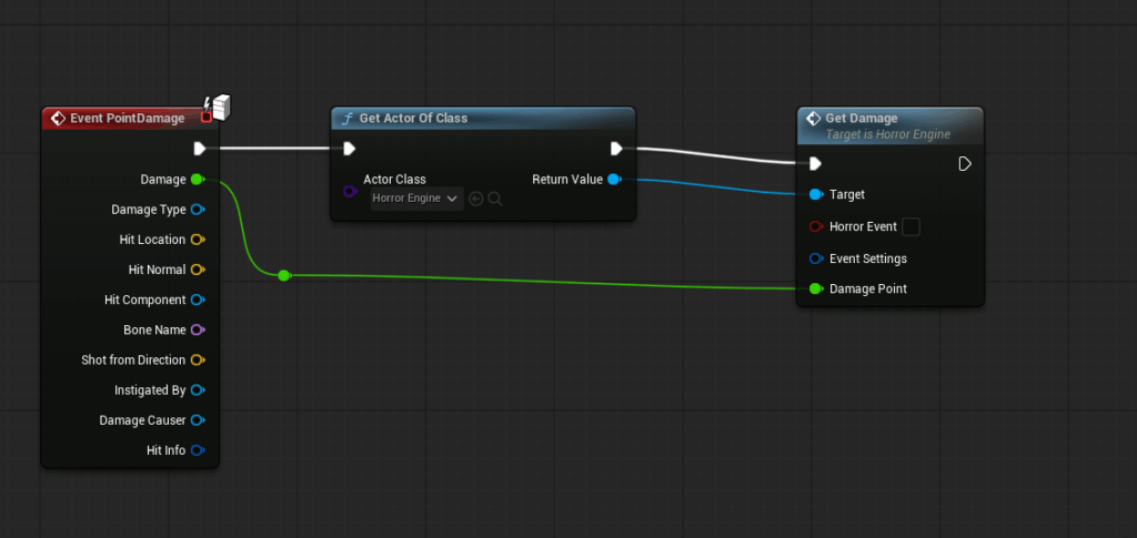 Open it and add “Event point damage”, get Actor of class “Horror Engine” and use it to access the Get Damage function and connect the damage value to it