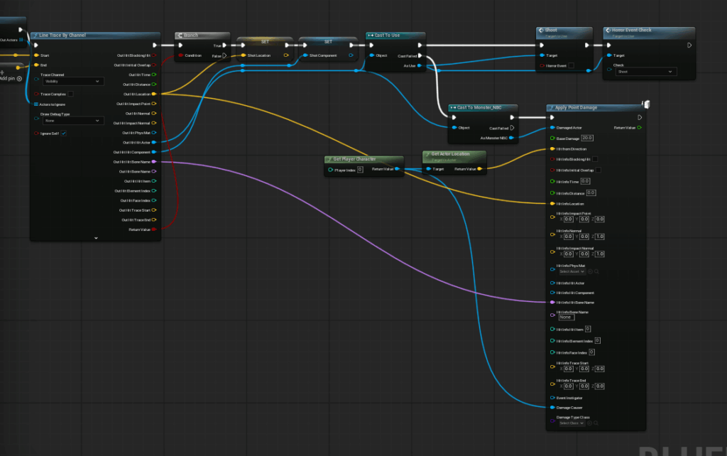 Connect the Hit from direction and the damage causer from “Get Player Character”, then split the hit info to connect it with the info you need from the gun line trace
